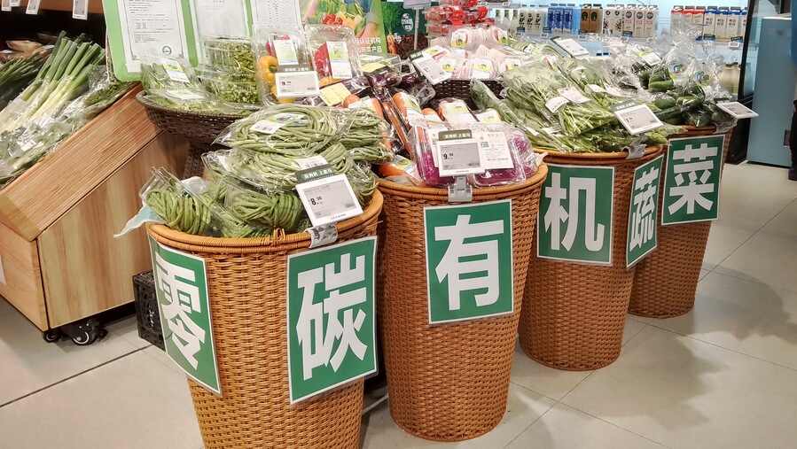 在盒马鲜生门店的蔬菜保鲜柜上,记者看到个别有机蔬菜的包装上多了一个绿色的圆形标签——由南京国环有机产品认证中心有限公司(简称“南京国环”)颁发的“零碳农产品”认证,这代表着这包蔬菜在生产过程中温室气体净排放量小于或等于零。