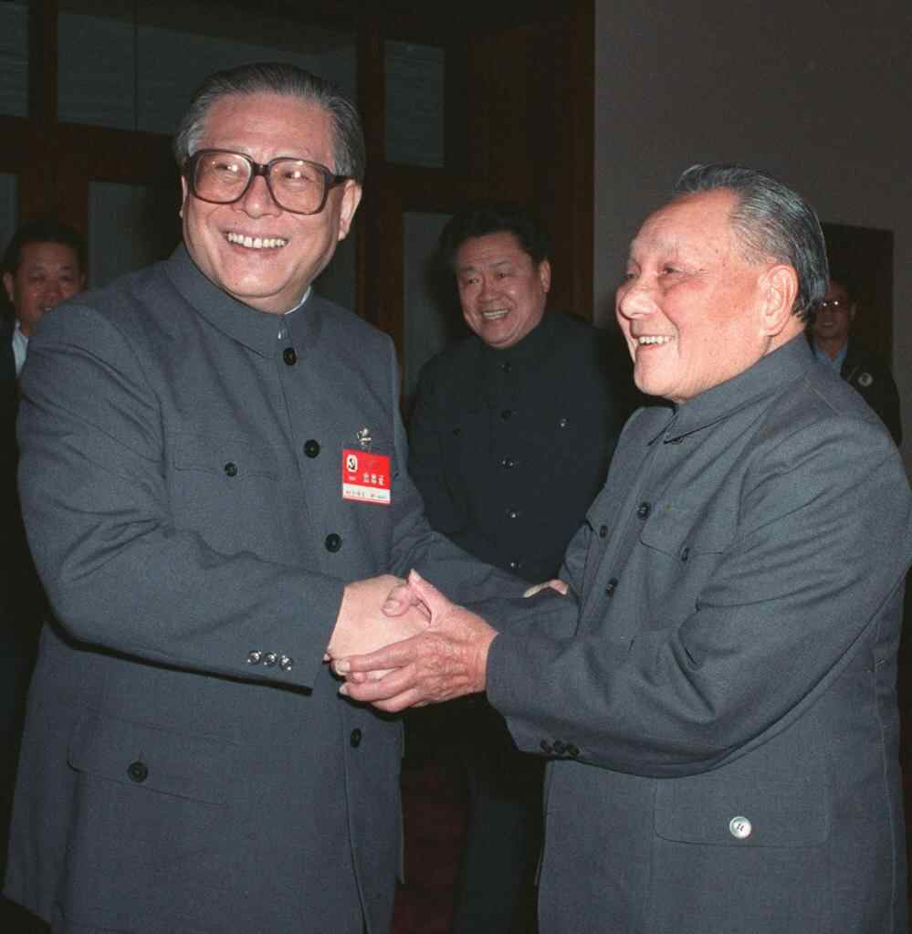 1989年11月6日至9日,中国共产党第十三届中央委员会第五次全体会议在北京召开。这是邓小平同志和江泽民同志亲切握手。新华社发