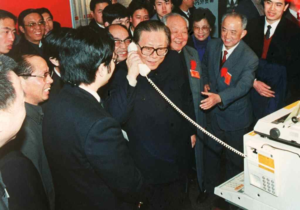 1984年5月,江泽民同志在北京展览馆举行的全国电子新产品展览会上,试用国际长途电话向远方的工作人员问候。新华社发