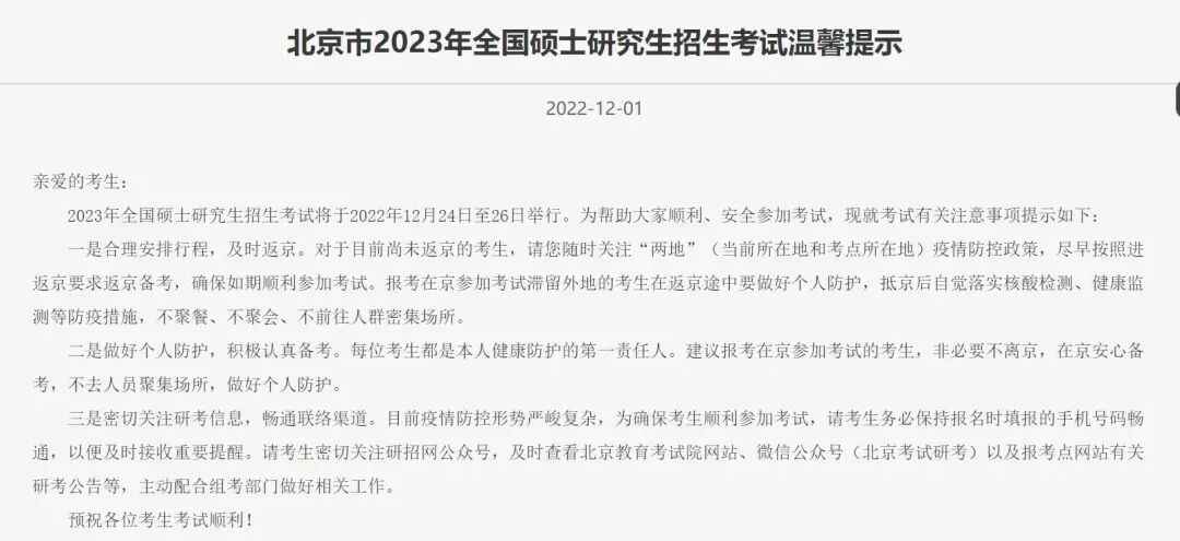如北京教育考试院 12月1日发布温馨提示,对于目前尚未返京的考生,随时关注当前所在地和考点所在地疫情防控政策,尽早按照进返京要求返京备考,确保如期顺利参加考试。