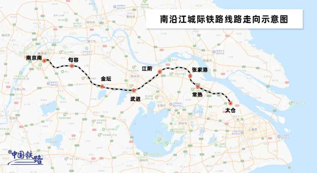 南沿江城际铁路,2018年开工建设,起于南京南站,止于太仓站,接驳沪苏通铁路后引入上海枢纽,设计时速350公里。这是沪宁间第二条城际铁路,建成通车后将承担沿线通道内以及沪宁主轴城市间的城际客流,推动句容、江阴、张家港、常熟、太仓等全国百强县加快融入沪宁“1小时高铁圈”。