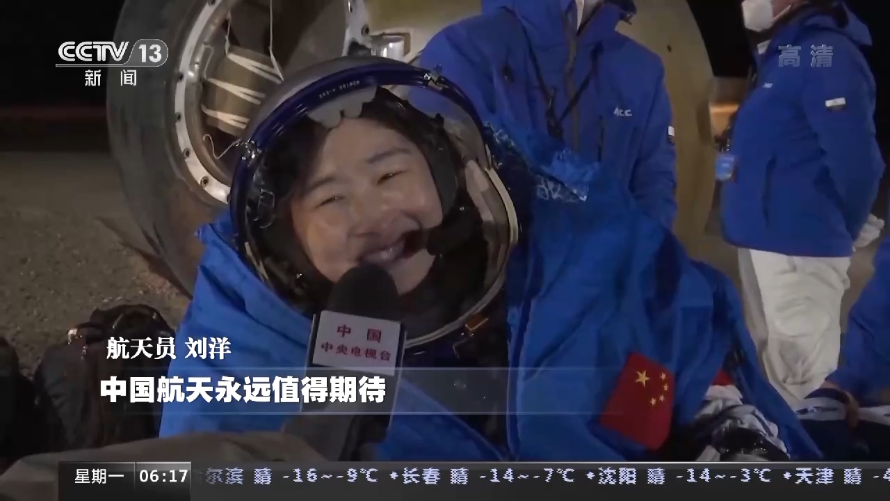 航天员 陈冬:六个月忙碌而又充实的太空之旅,很有幸见证了中国空间站基本构型建成。我们像流星一样回到祖国的怀抱,我为伟大祖国感到骄傲。