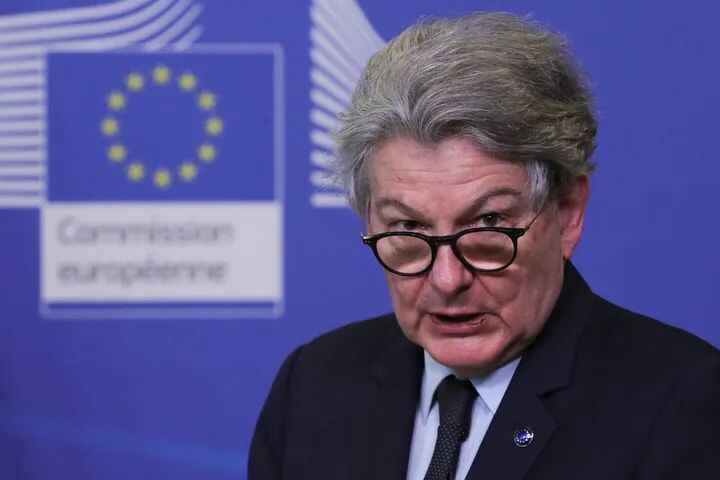 ▲欧盟委员会负责内部市场的委员蒂埃里·布雷东在比利时布鲁塞尔的欧盟委员会总部就欧盟《芯片法案》发言。(新华社)