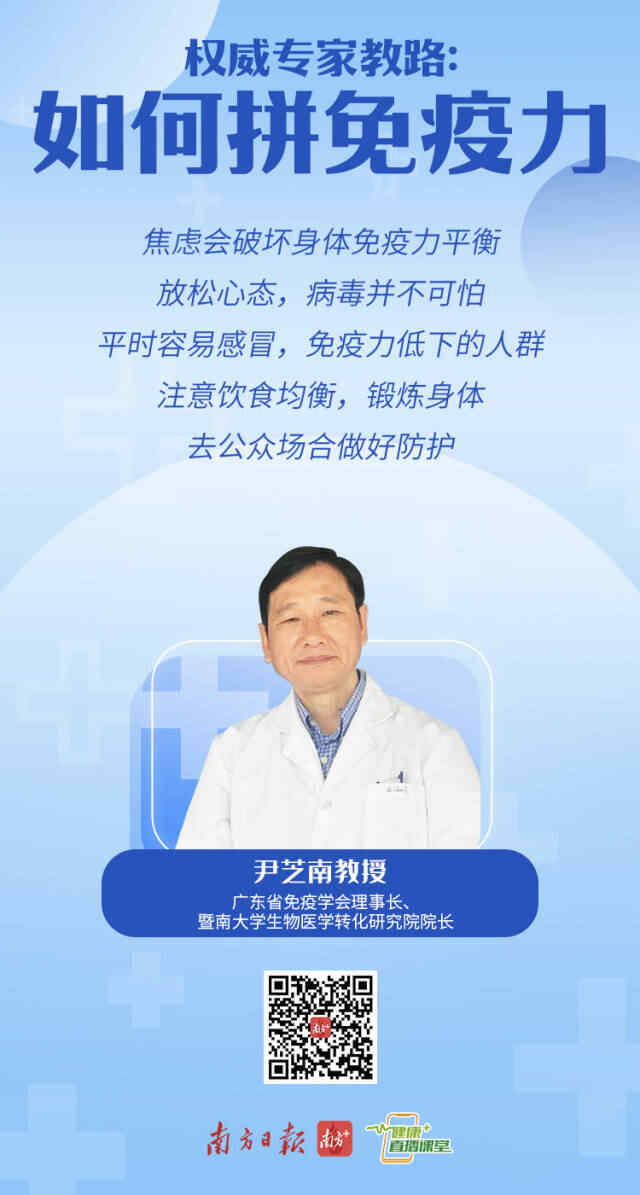 疫情防控优化,网友说“拼免疫力”的时候到了。众所周知,免疫系统是保护身体的“防火墙”,那么,哪些人需要特别关注免疫力?免疫力低下感染病毒几率会上升吗?具体该如何“拼“免疫力?如何做好自己健康的第一责任人?南方日报、南方+“健康+直播课堂”邀请多位免疫学界的权威专家,为大家讲解如何构筑免疫力“防火墙”。