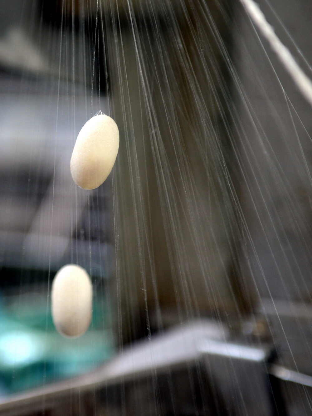 人工纺丝的主要材料是对蚕茧处理后提取的丝素蛋白。“丝素蛋白是从蚕丝中提取的天然高分子纤维蛋白,其主要来源包括将蚕茧进行脱胶溶解处理得到的再生丝素蛋白和提取自蚕丝腺中的天然丝素蛋白原液。由于后者需要逐个解剖家蚕,制备过程复杂且耗时,成本相对较高。因此,大多数人工纺丝所用的原材料都是再生丝素蛋白。”林志介绍。