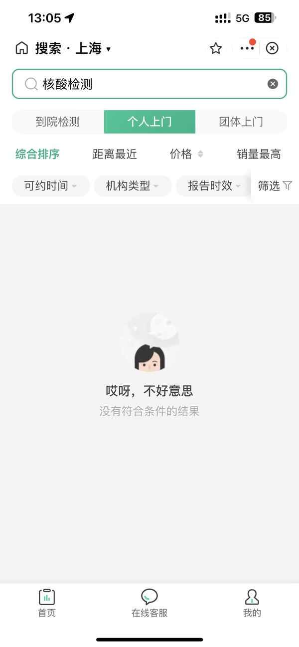 这一通知,直接让上海的上门核酸检测服务停止。2022年12月7日,记者定位上海,查询“阿里健康核酸检测”,显示已经没有了这项业务。