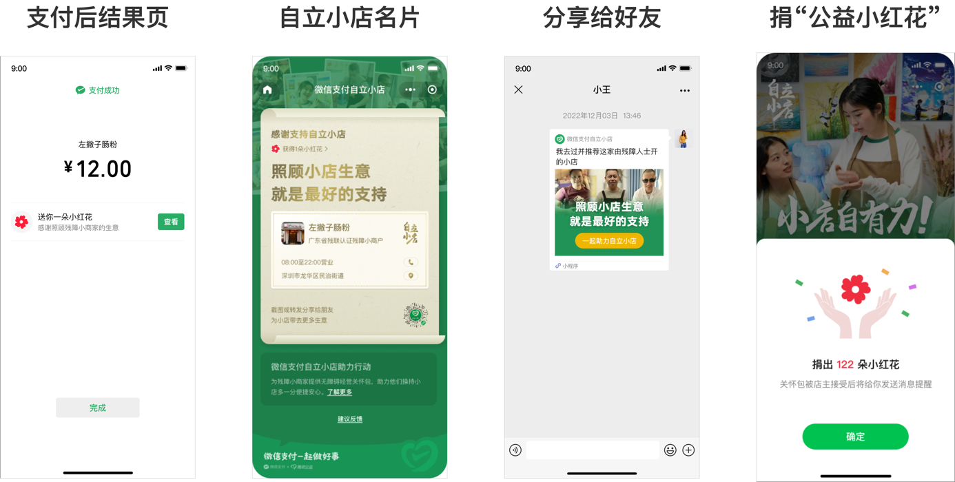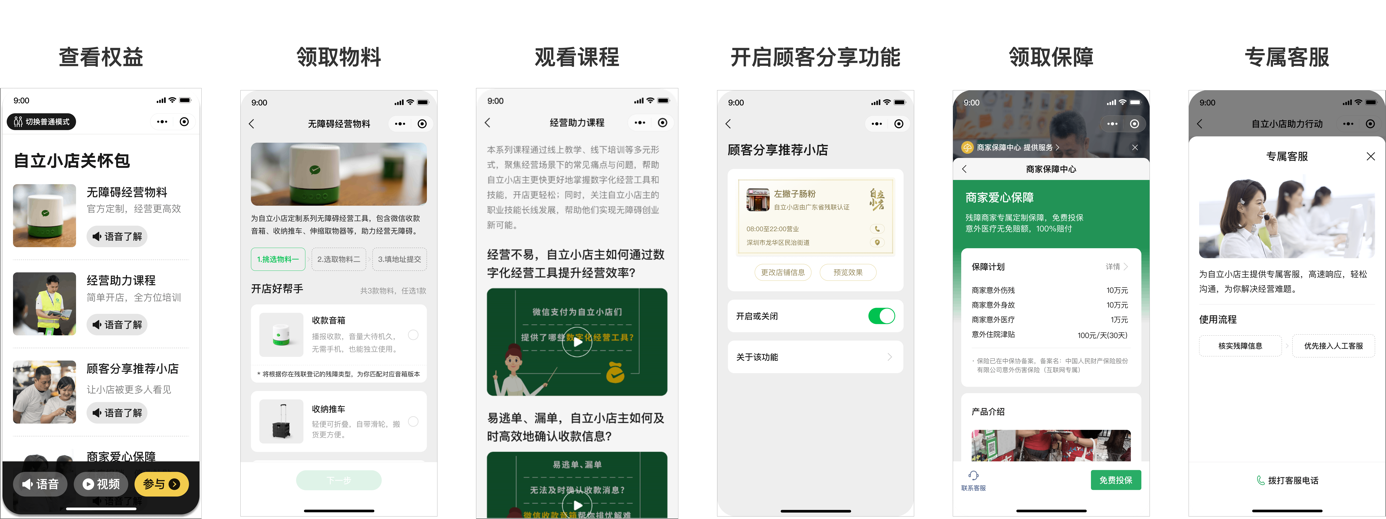 其中,微信支付将为“自立小店”免费提供五大专属关怀:无障碍经营工具关怀礼包;扶弱助残商家爱心保障;顾客分享推荐小店及公益小红花捐赠公益功能;数字经营培训系列;专属客服一对一咨询服务。
