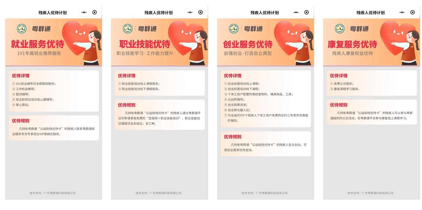 借助“粤群通”平台及微信支付连接能力,省残疾人就业创业促进会联合相关机构逐步推出“公益助残优待卡”,通过建立扶残助残“绿色通道”,实现公益行为数字化,持续为残疾人提供“互联网+职业技能培训”及就业推荐、创业指导、心理咨询等更加丰富的公益优待服务及参加公益助残“微心愿”活动权益,努力让残疾人在全过程无需亮证的情况下,享受越来越多优待优惠服务。
