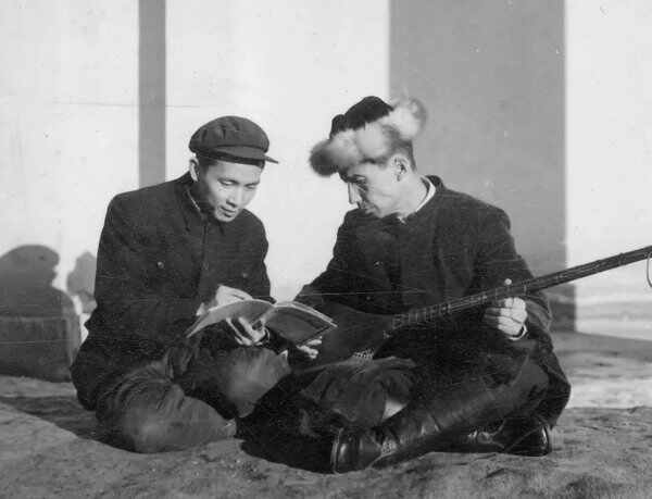 简其华(左)采访伊犁古典歌曲的演唱者、著名维吾尔族艺人阿布杜维里。(1963年)