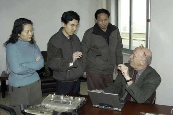 2003年12月5日,时任奥地利国家科学院音响档案馆馆长迪特里希·舒勒(右一)到中国艺术研究院图书馆(现艺术与文献馆)指导音响资料管理工作。
