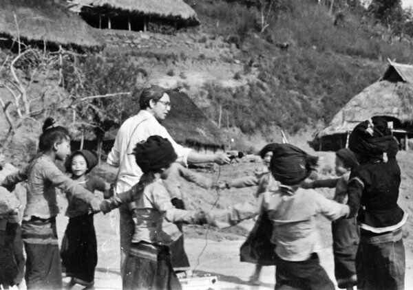 伍国栋(录音者)在云南勐海县曼玛寨为布朗族儿童歌舞现场录音。(1984年)