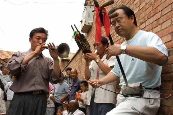 田青(右一)在山西左权红都村考察,与民歌手石占明一起演奏左权小花戏。(2003年)