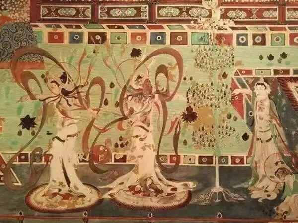 敦煌莫高窟220窟盛唐时期所绘的大幅经变画中,既有动作相对缓慢的双人舞(可看作是胡旋的起始形象),又有特征明显的急速胡旋图。其北壁《药师经变图》下端绘有场面辉煌的胡旋舞图。舞伎分为文、武两组,都足踏小圆花毯翩翩起舞。这对舞伎披着发辫,相向而舞。两臂平举,双足着毯,从舞巾的抛洒飞动之势,可以感受到她们旋转的速度,不禁让我们想起了元稹、白居易等诗人对胡旋女舞姿的描摹,也印证了《新唐书·音乐志》中“胡旋舞,舞者立毬(毯)上,旋转如风”的记载。