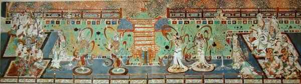 从这幅胡旋舞图的全貌我们亦可一窥“忆昔开元全盛日”的盛唐气象。舞台中央摆着中原式方形灯楼,舞者两侧又各置西域式树形灯轮,烘托出光芒耀眼的热烈气氛。两侧添灯火的菩萨颇似人间舞台上负责灯光场地的工作人员。如此盛大的乐舞场面,或许正是唐朝宫廷宴乐的写照。左右二十八名不同肤色的各族乐工,一起演奏着来自中原和西域的乐器。