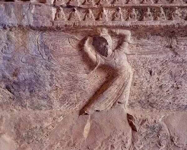 龙门石窟万佛洞北壁胡旋舞舞者形象。(图片来源:龙门石窟景区)