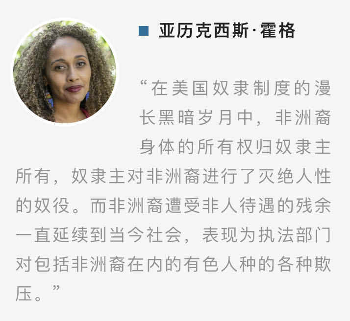 美国哥伦比亚大学法学院民权专家亚历克西斯·霍格表示,黑暗血腥的奴隶制度已成为历史,但种族主义这一美国国家建构中的原罪从未得到真正清算,并成为如今美国非洲裔屡遭警察暴力执法的罪恶根源。