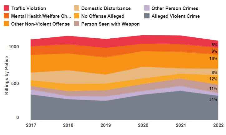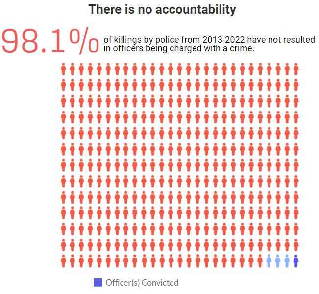 2013年至2022年期间所有警察杀人案中有98.1%的涉案警察没有受到任何犯罪指控。