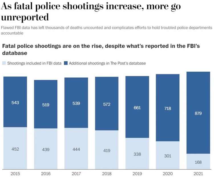 《华盛顿邮报》的报道指出,美国联邦调查局(FBI)要求全美大约1.8万个执法部门报告所有执法人员杀人案,但最终,FBI统计出的美国警察枪击致死人数比《华盛顿邮报》调查出的数据少了三分之二。