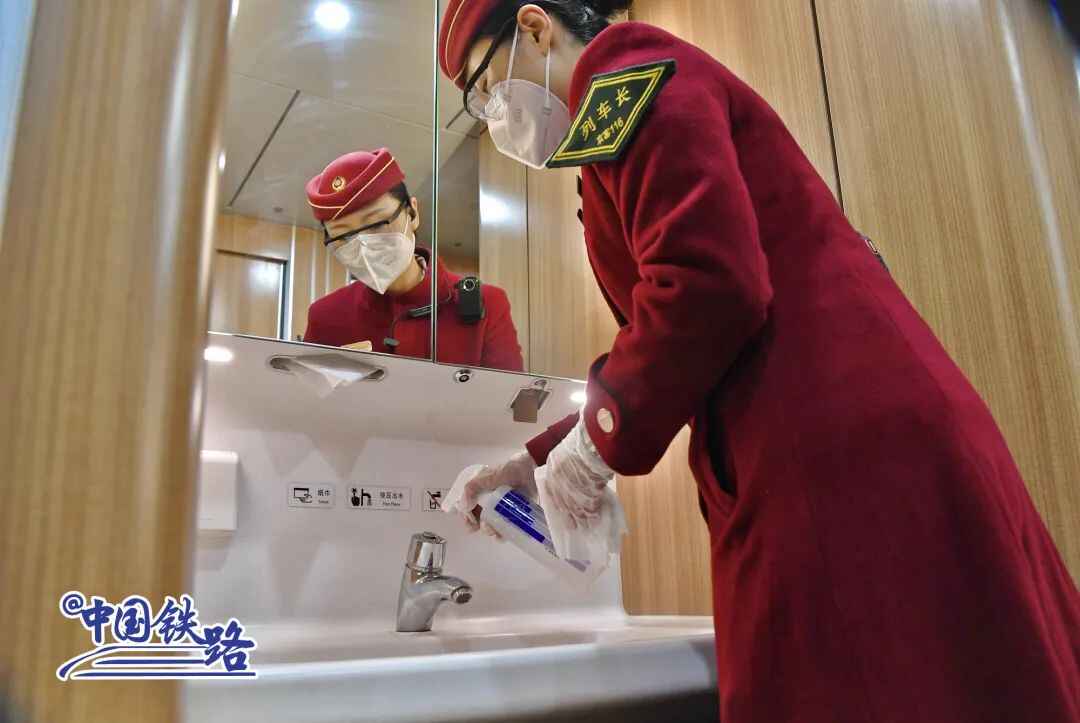 在列车运行途中,乘务人员会定时对洗手池水龙头等重点部分进行消毒清洁。