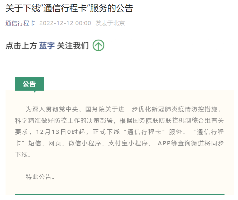 12月12日0时,通信行程卡发布官方公告,将于次日正式下线“通信行程卡”服务。这意味着继取消乘坐飞机和火车核酸证明后,另一跨市跨省出游限制措施也正式取消。
