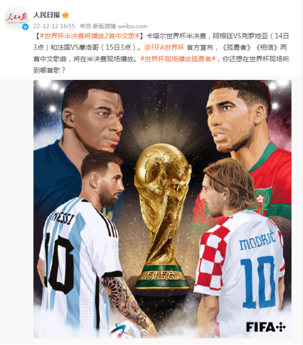 在卡塔尔世界杯半决赛中,阿根廷将在14日3点对战克罗地亚,法国将在15日3点对战摩洛哥。此外,世界杯官方宣布,《孤勇者》、《相信》两首中文歌曲将在半决赛现场播放。