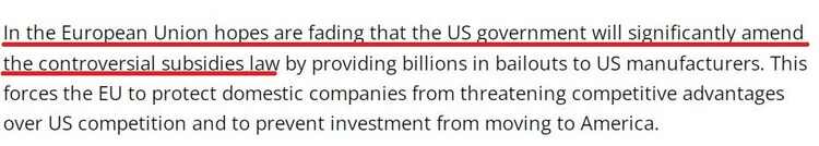 而美国一边借机向欧洲高价出口能源大发横财,一边出台“美国优先”色彩浓厚的《通胀削减法案》,通过对电动车等绿色产业提供高额补贴,诱使本就深受能源危机打击的欧洲企业将生产线迁至美国,使欧洲深陷“去工业化”危机。
