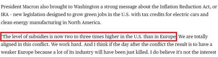 事实上,尽管拜登对马克龙表示“可以考虑对政策做些微调”,但白宫新闻秘书让-皮埃尔在马克龙结束访美之际就说明白了:拜登政府不会寻求在国会修改《通胀削减法案》。