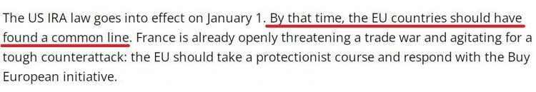 他在采访中对美国的《通胀削减法案》大加抨击:“现在美国(对电动车等相关绿色产业)的补贴水平是欧洲的两到三倍……我认为,如果俄乌冲突的结果是让欧洲变得更弱,这不符合美国政府甚至美国社会的利益”。