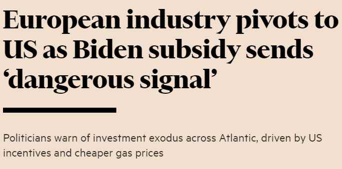 英国《金融时报》:美国低廉的能源价格和《通胀削减法案》中的补贴政策吸引欧洲企业将生产线转移至美