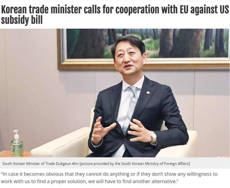 安德根日前在接受欧洲媒体采访时表示,欧盟和韩国应该合作应对美国的《通胀削减法案》,“将法案的歧视性影响降至最低”。