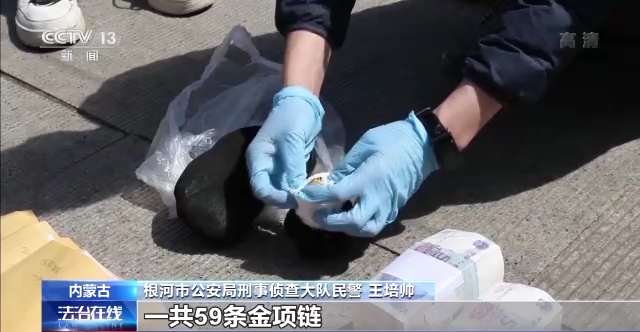 根河市公安局刑事侦查大队民警 王培帅:在一个狗窝里,狗窝的一个房梁上面,发现了一个袜子包的圆圆的东西,把它打开一看,赃物就在那里,一共59条金项链,一条也不少。