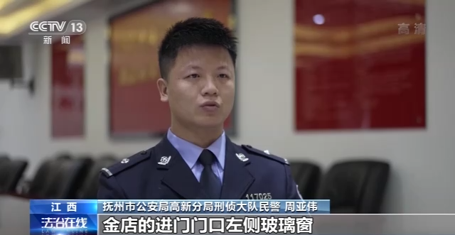 抚州市公安局高新分局刑侦大队民警 周亚伟:金店的进门门口左侧玻璃窗被砸了将近有五十厘米的洞口。