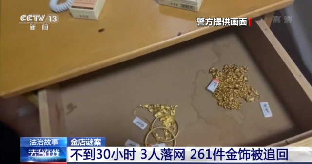 在现场,警方共追回261件黄金首饰。据了解,部分饰品已经被犯罪嫌疑人销赃,不过销赃得到的钱还没有来得及花,他们就被警方抓获了,此时距离案发过去了不到30个小时。