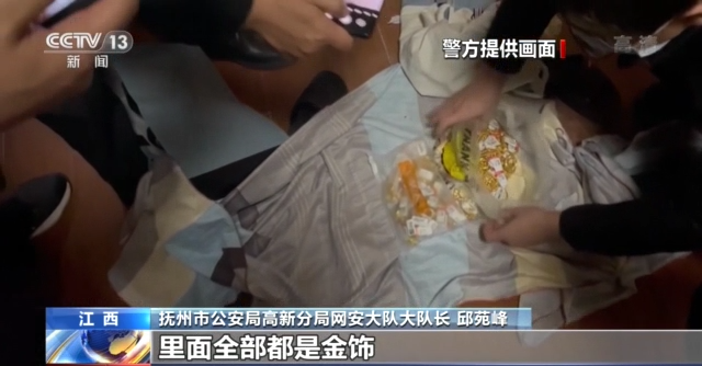 抚州市公安局高新分局网安大队大队长 邱苑峰:在现场他们就交代,把其他的赃物藏在当时房间的一张床的床下。我们把那张床翻开,发现里面有一个包袱,包袱里面全部都是金饰。