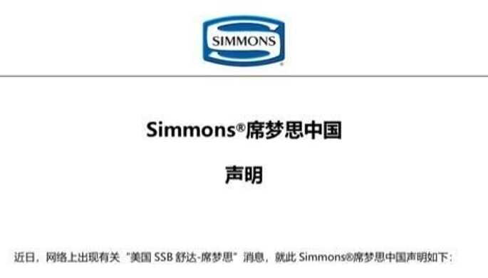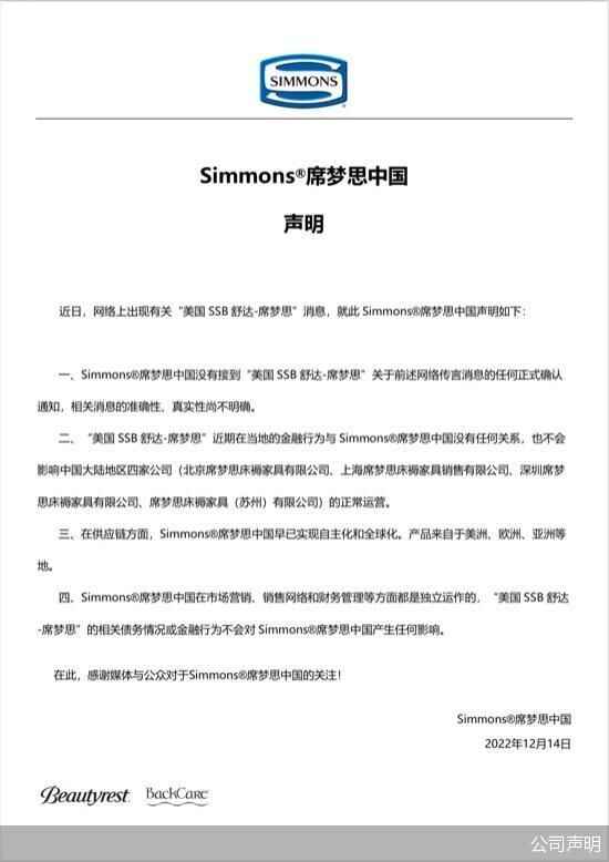 针对近期媒体报道的有关“美国 SSB 舒达-席梦思申请破产”的消息,Simmons®席梦思中国发布声明称,没有接到“美国 SSB 舒达-席梦思”关于前述网络传言消息的任何正式确认通知,席梦思中国营销、销售网络和财务管理等方面都是独立运作的,“美国 SSB 舒达 -席梦思”的相关债务情况或金融行为不会对 Simmons®席梦思中国产生任何影响。