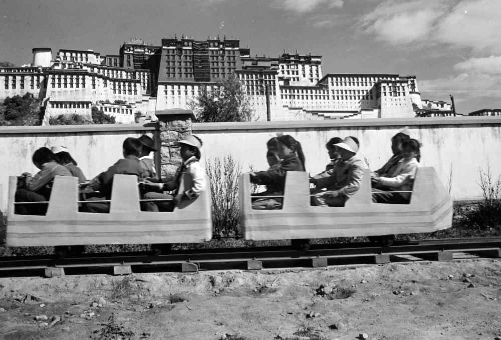 ↑ 1987年10月1日,在拉萨劳动人民文化宫内新建成一座大型游乐场里,小朋友们在乘坐电动小火车。