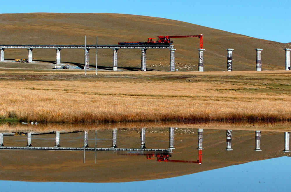 ↑ 2005年5月15日,青藏铁路铁轨在西藏那曲市境内铺设。