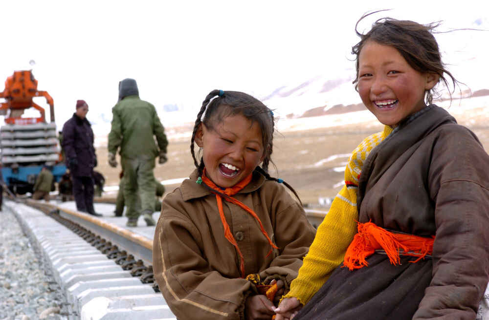 ↑ 2005年3月30日,两名藏族孩子在家附近的青藏铁路建设工地玩耍。