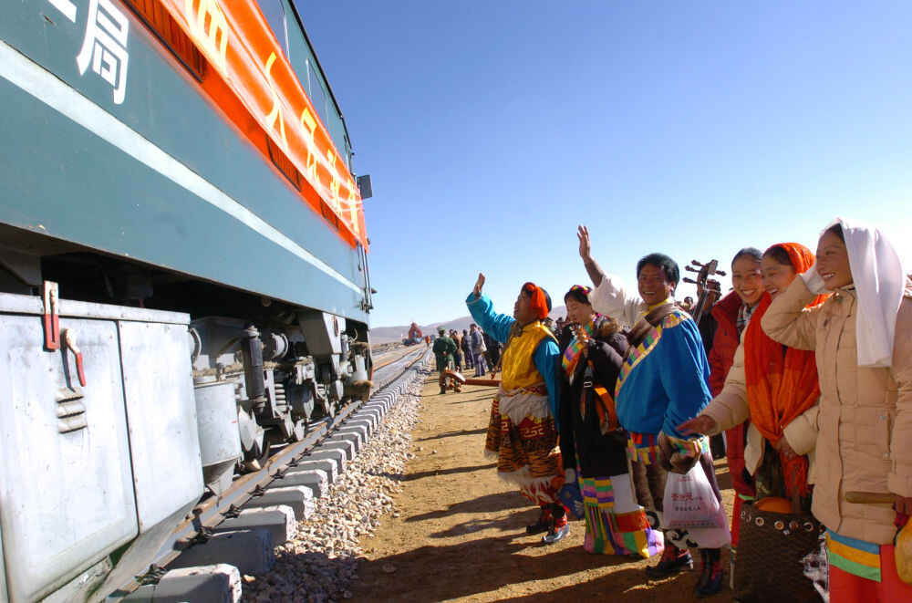 ↑ 2004年10月10日,藏北群众迎接火车抵达那曲。10月9日,青藏铁路安多到那曲138公里的铺轨完成。10月10日,从安多出发的西藏境内第一列火车上午10点抵达藏北重镇——那曲镇。
