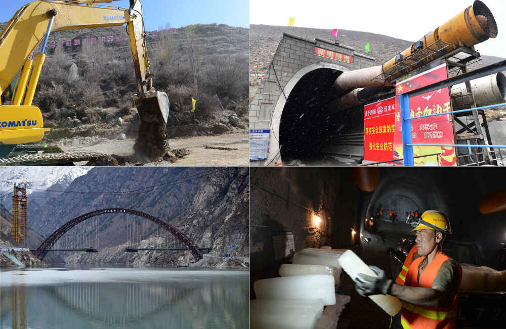 ↑ 拼版资料左上图:拉林铁路西藏桑日县桑珠岭隧道开工(2014年12月19日摄);左下图:施工中的藏木特大桥(2020年4月5日摄);右上图:拉林铁路藏嘎隧道施工中(2020年4月5日摄);右下图:工人把大量冰块搬进桑珠岭隧道,用来降温(2017年4月11日摄)。