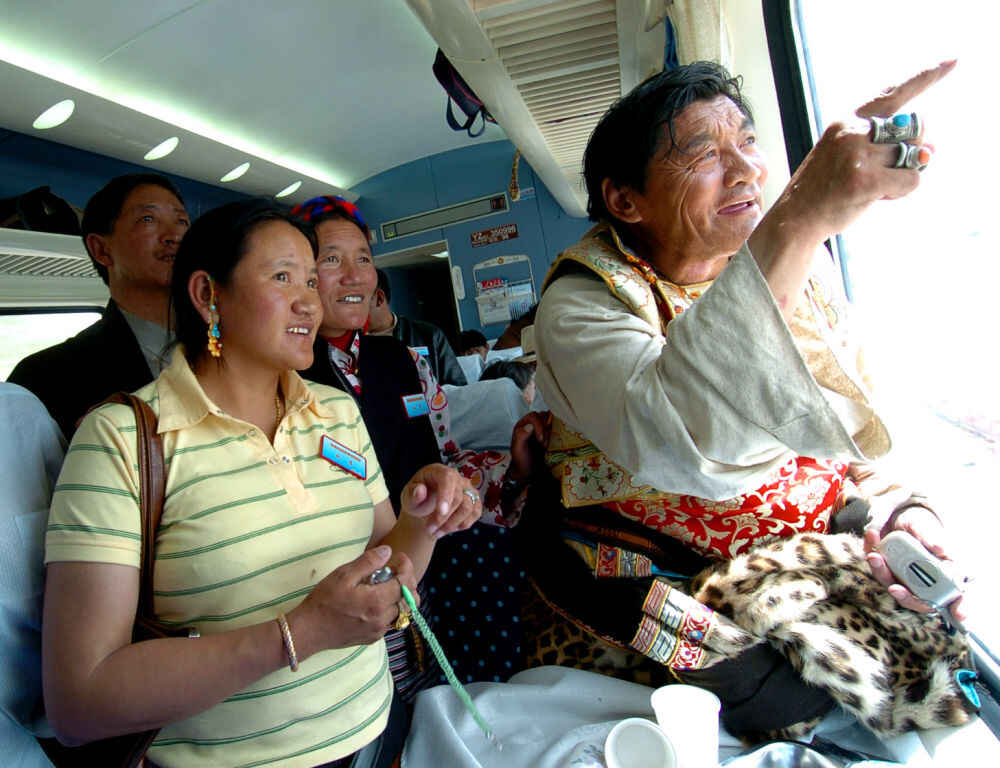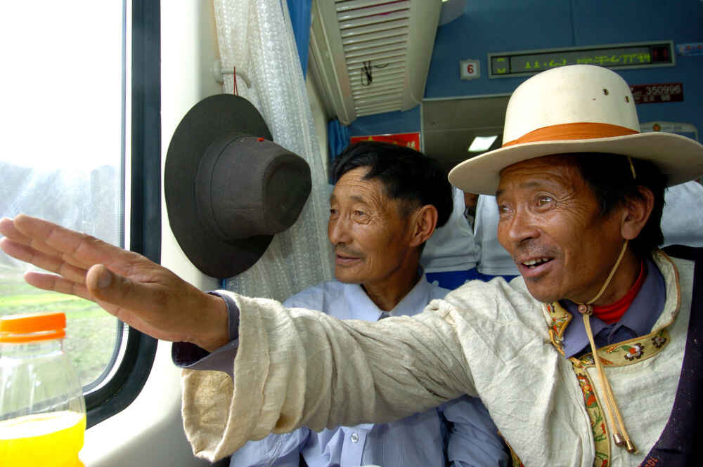 ↑ 2006年7月1日,乌金(右一)在“藏2”次列车经过自己家乡安多时,兴奋地指向车外,向同伴介绍。