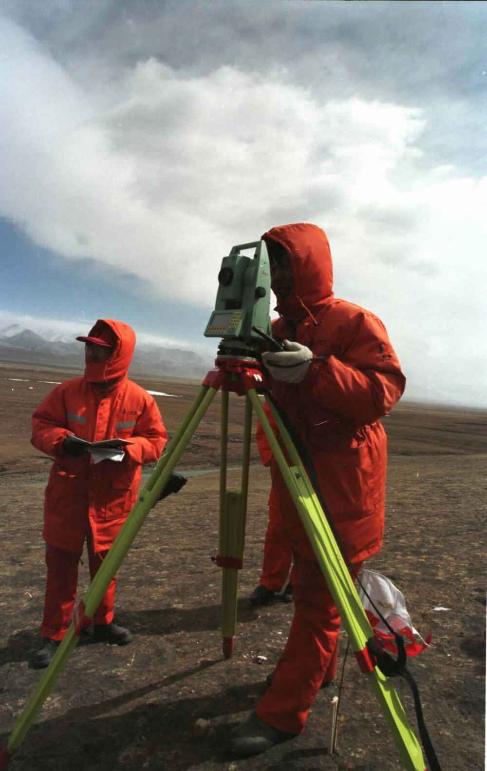 ↑ 2001年4月,铁道部第一设计院的勘测人员在海拔近5000米的四道梁加紧进行青藏铁路的勘测工作。在国务院批准修建青藏铁路后,铁道部第一设计院的上千名勘测人员克服恶劣的自然条件,为青藏铁路早日开工夜以继日地工作。