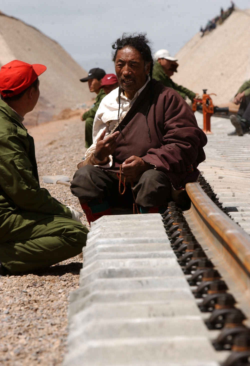 青藏铁路的建设工地成为了附近居民最大的关注点,老乡们来到工地东瞅瞅、西瞧瞧,好奇地摸摸铁轨,或者甚至拉着工人们问问这、问问那——尽管很多时候,由于语言不通的缘故,他们并不能够了解对方在说什么。在故乡人的脸上,我看到了对未来变化的憧憬,以及对铁路建成越来越急迫的渴望。