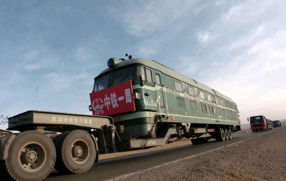 ↑ 2005年4月19日,一辆汽车上装着一辆机车,从青海省格尔木市秀水河车站经过青藏公路向西藏安多方向行驶。青藏铁路建设总指挥部从2004年3月开始陆续把近200台机车、铺轨机、架桥机、轨道车等大型铺架设备用汽车从格尔木安全运抵西藏安多,途中翻越海拔5231米的唐古拉山垭口,创造了铁路建设史上的奇迹。