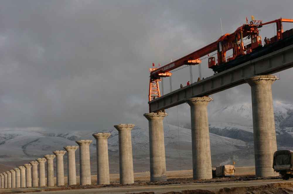 ↑ 2004年10月1日,工人们正在架设青藏铁路那曲以桥代路特大桥。