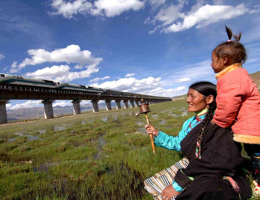 ↑ 2006年6月17日,白玛拉姆背着尼玛拉姆看着从自家门口驶过的火车。