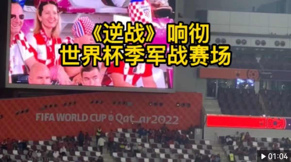 北京时间12月17日,世界杯季军战比赛前,由歌手张杰演唱的《逆战》在赛场播放。张杰回应称“很开心《逆战》能在世界杯三四名决赛现场响起,祝运动员们比赛尽兴,不留遗憾!加油。”