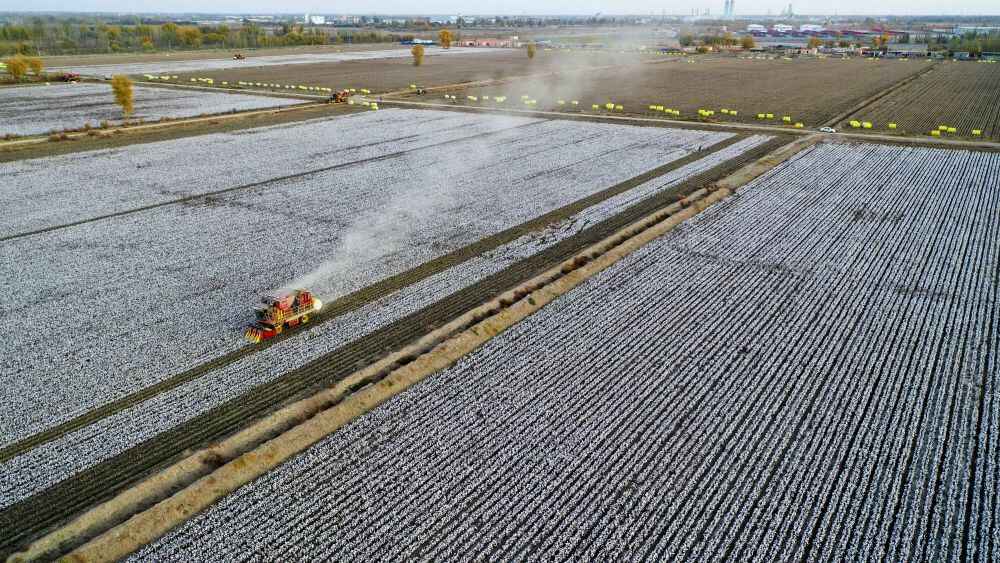采棉机在新疆沙雅县海楼镇的棉田里采收棉花(2022年11月10日摄,无人机照片)。新华社发(柳玉柱 摄)