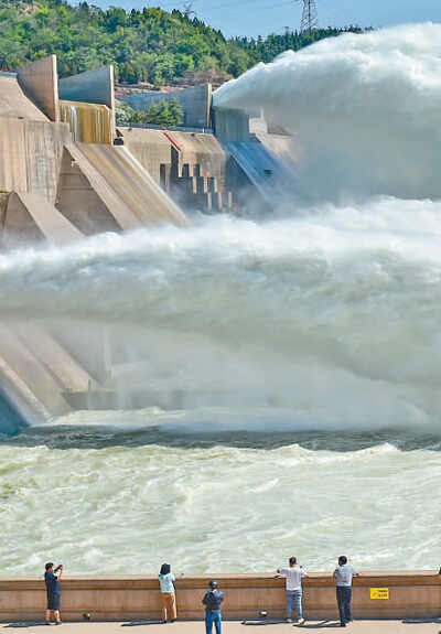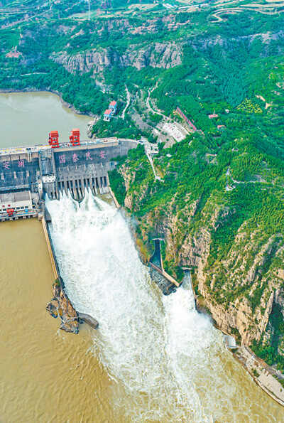 三门峡水利枢纽是新中国成立后在黄河干流上兴建的第一座大型水利枢纽工程,连接豫晋两省,1961年4月基本建成投运。现阶段,三门峡水利枢纽作为黄河下游防洪工程体系的重要环节,与小浪底、万家寨一起在调水调沙联合运用中起着十分重要的承上启下的作用。 图为三门峡水利枢纽开启闸门调水调沙。 孙 猛摄(影像中国)