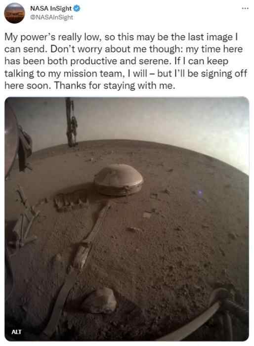 当地时间19日,运营团队模仿“洞察号”的口吻在推特上写道:“我的电量真的很低,所以这可能是我能发送的最后一张图像。不过,不要为我担心:我在这里的时光既富有成效又平静。如果我能继续和我的任务小组交流,我会这样做的,但我很快就会在这里下线。谢谢你们陪着我。”